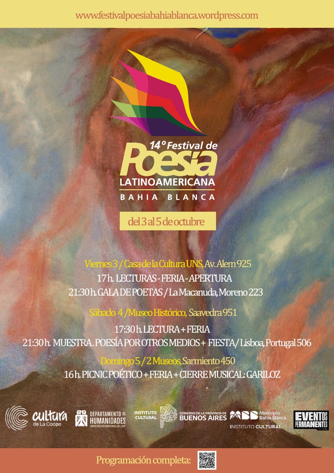 Para conocer todas las actividades que se realizarán del 3 al 5 de octubre en el Festival de Poesía Latinoamericana, podés ingresar a https://festivalpoesiabahiablanca.wordpress.com/ o sino en sus redes sociales.