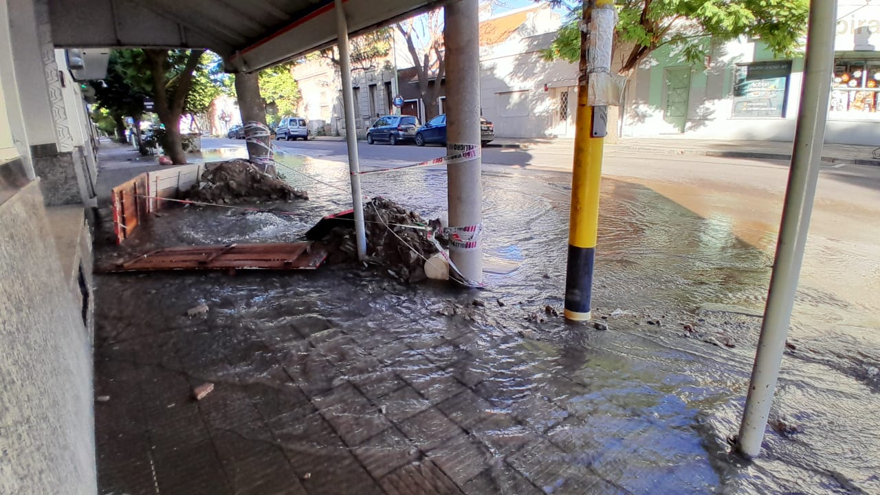 Esta mañana la esquina de Brown y Undiano apareció totalmente inundada debido a una importante pérdida en el sector, donde se encuentra una reconocida heladería de la ciudad.